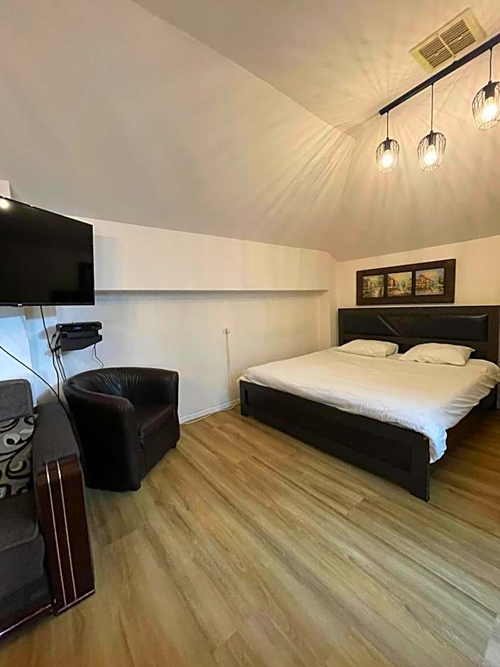 A very spacious room with an extra long bed, a kitchenette and fridge. The additional sofa opens into a double bed. The room also features a shower and toilet. A plasma TV with cable channels is available, while the fridge offers free mineral water.